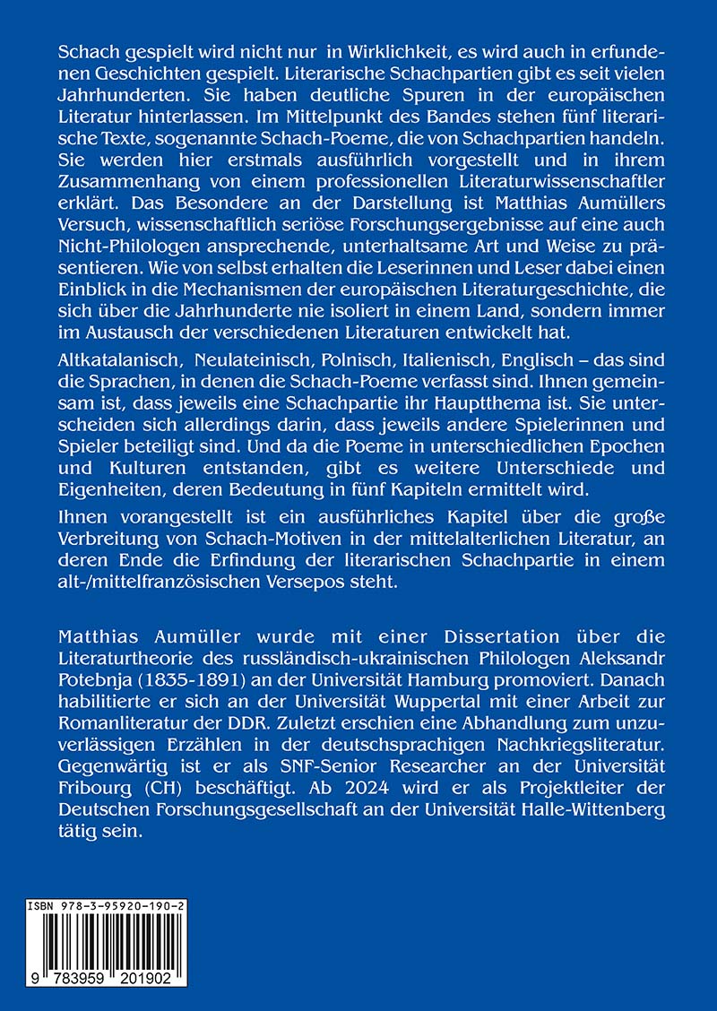 Schach gespielt wird nicht nur in Wirklichkeit, es wird auch in erfundenen Geschichten gespielt. Literarische Schachpartien gibt es seit vielen Jahrhunderten. Sie haben deutliche Spuren in der europäischen Literatur hinterlassen. Im Mittelpunkt des Bandes stehen fünf literarische Texte, sogenannte Schach-Poeme, die von Schachpartien handeln. Sie werden hier erstmals ausführlich vorgestellt und in ihrem Zusammenhang von einem professionellen Literaturwissenschaftler erklärt. Das Besondere an der Darstellung ist Matthias Aumüllers Versuch, wissenschaftlich seriöse Forschungsergebnisse auf eine auch Nicht-Philologen ansprechende, unterhaltsame Art und Weise zu präsentieren. Wie von selbst erhalten die Leserinnen und Leser dabei einen Einblick in die Mechanismen der europäischen Literaturgeschichte, die sich über die Jahrhunderte nie isoliert in einem Land, sondern immer im Austausch der verschiedenen Literaturen entwickelt hat.