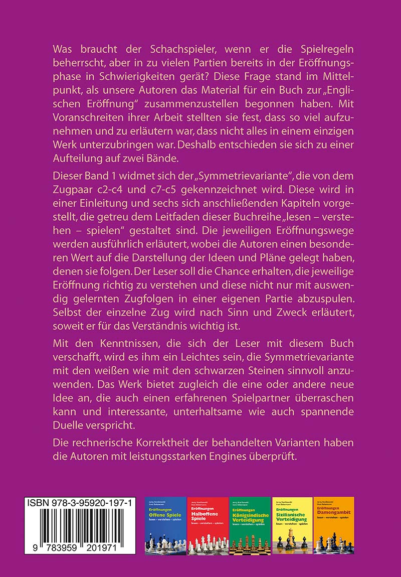 Dieser Band 1 widmet sich der „Symmetrievariante", die von dem Zugpaar c2-c4 und c7-c5 gekennzeichnet wird. Diese wird in einer Einleitung und sechs sich anschließenden Kapiteln vorgestellt, die getreu dem Leitfaden dieser Buchreihe „lesen – verstehen – spielen" gestaltet sind. Die jeweiligen Eröffnungswege werden ausführlich erläutert, wobei die Autoren einen besonderen Wert auf die Darstellung der Ideen und Pläne gelegt haben, denen sie folgen. Der Leser soll die Chance erhalten, die jeweilige Eröffnung richtig zu verstehen und diese nicht nur mit auswendig gelernten Zugfolgen in einer eigenen Partie abzuspulen. Selbst der einzelne Zug wird nach Sinn und Zweck erläutert, soweit er für das Verständnis wichtig ist.