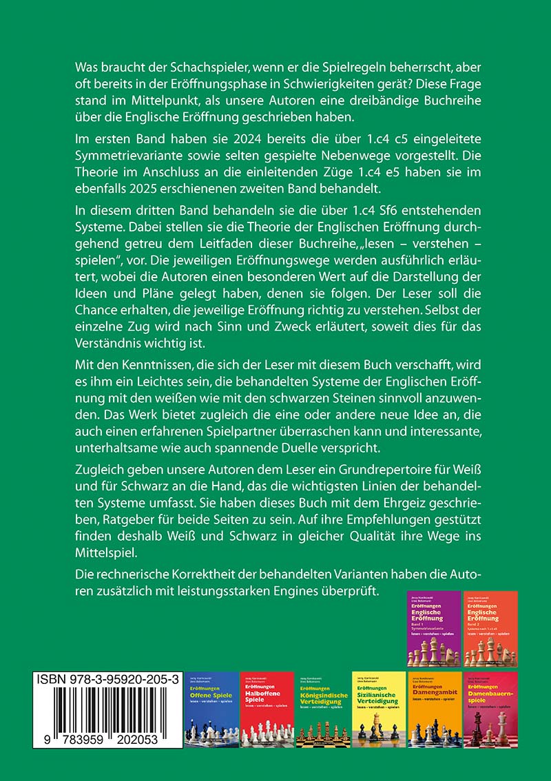 Nachdem im ersten Band (2024) die Symmetrievariante nach 1.c4 c5 sowie seltener gespielte Nebenwege im Fokus standen und der zweite Band (2025) die Systeme nach 1.c4 e5 beleuchtet hat, widmet sich der abschließende dritte Band nun den spannenden Fortsetzungen nach 1.c4 Sf6.