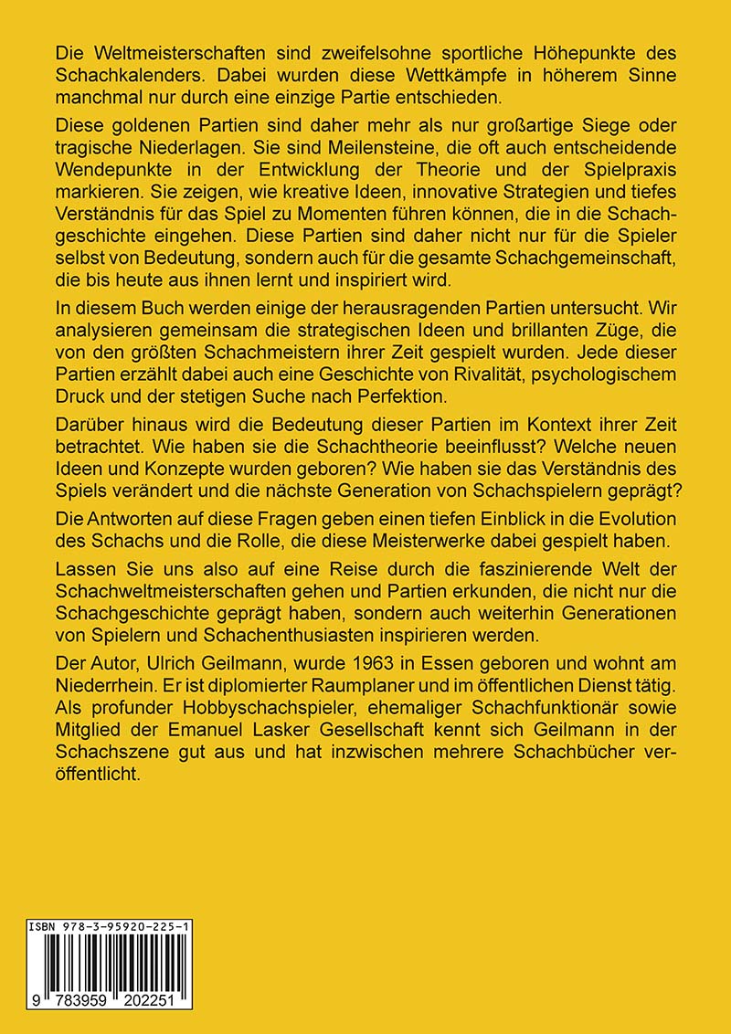 Der Autor, Ulrich Geilmann (Jahrgang 1963), lebt am Niederrhein und ist diplomierter Raumplaner im öffentlichen Dienst. Als engagierter Hobbyschachspieler, ehemaliger Funktionär und Mitglied der Emanuel Lasker Gesellschaft kennt er die Schachszene bestens. Zudem veröffentlichte er bereits mehrere Schachbücher.