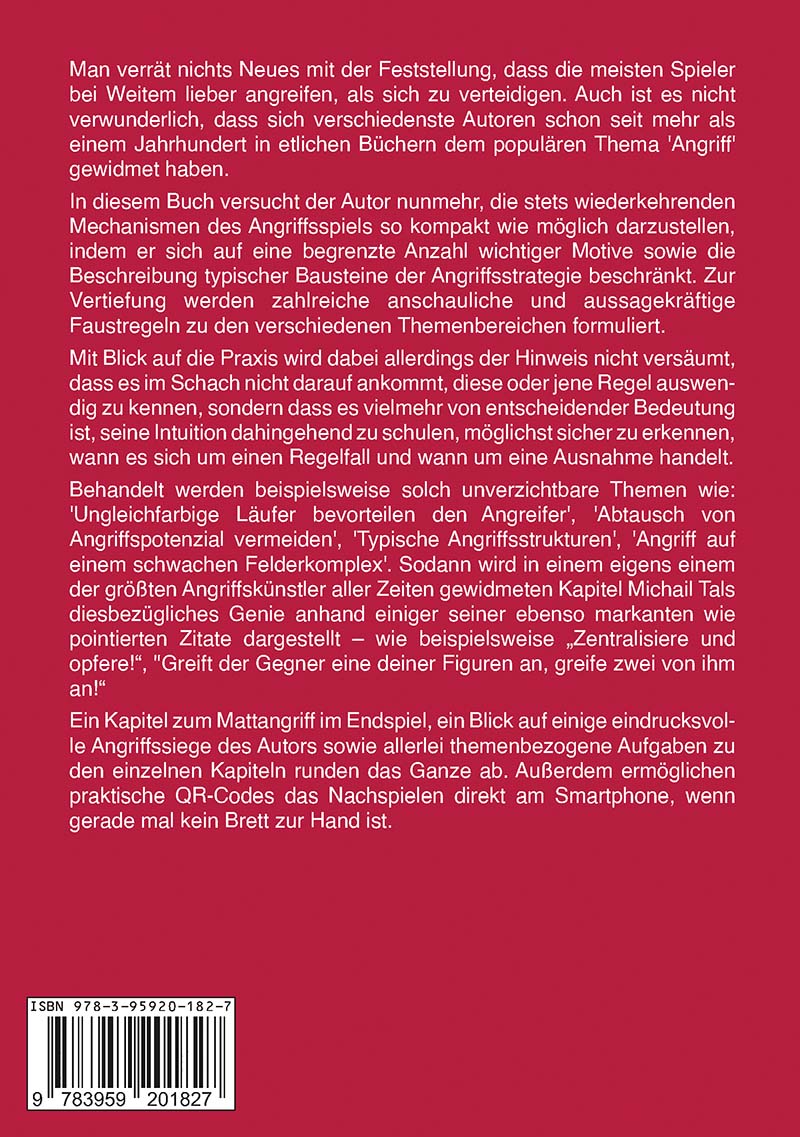 Ein Kapitel zum Mattangriff im Endspiel, ein Blick auf einige eindrucksvolle Angriffssiege des Autors sowie allerlei themenbezogene Aufgaben zu den einzelnen Kapiteln runden das Ganze ab. Außerdem ermöglichen praktische QR-Codes das Nachspielen direkt am Smartphone, wenn gerade mal kein Brett zur Hand ist.