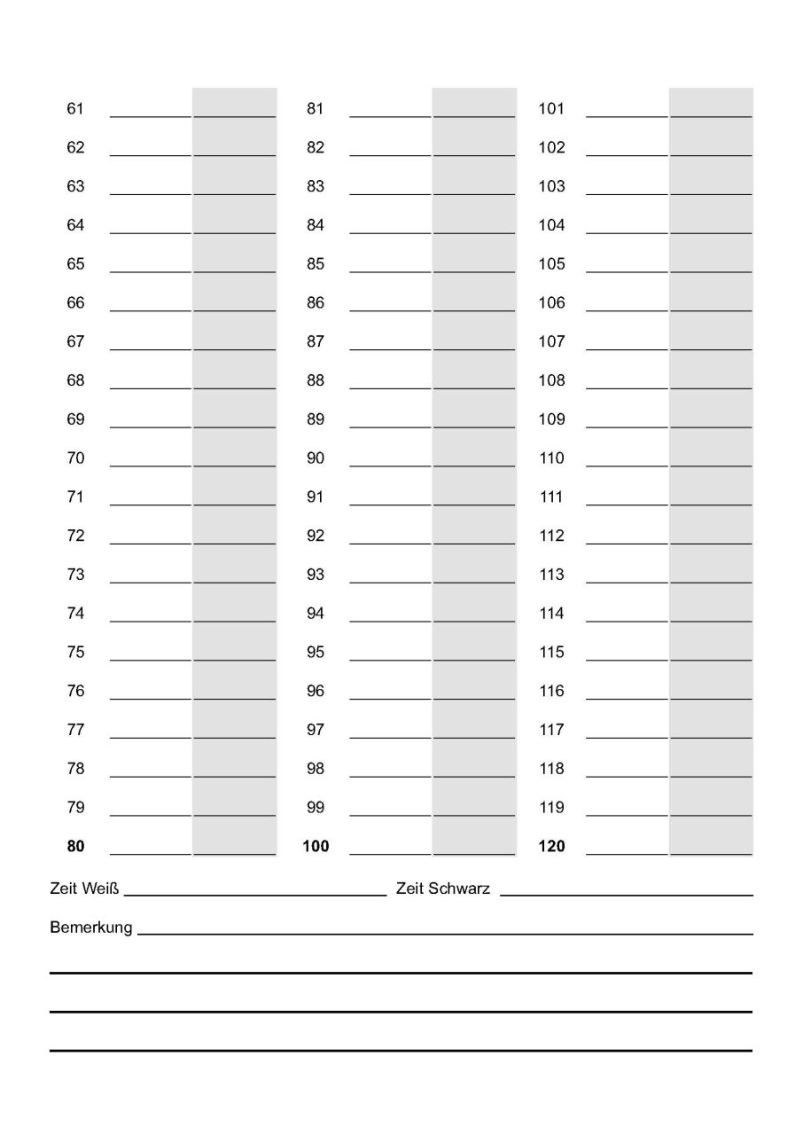 - Kapazität: Platz für 20 Partien, 120 Züge (1-60 auf der Vorderseite, 61-120 auf der Rückseite)