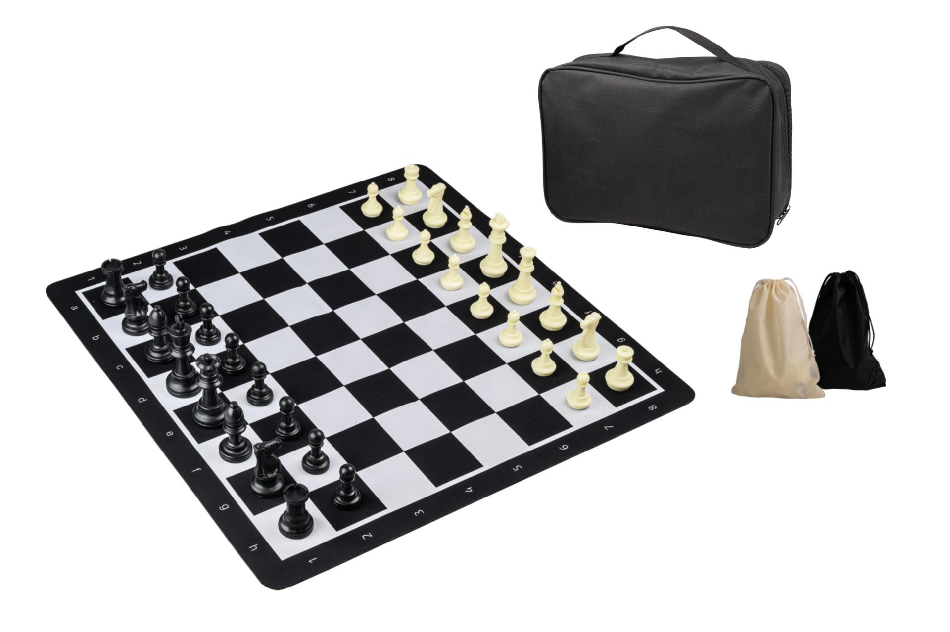 Schachset, rollbar, Feld 55 mm, mit Figuren und Tragetasche