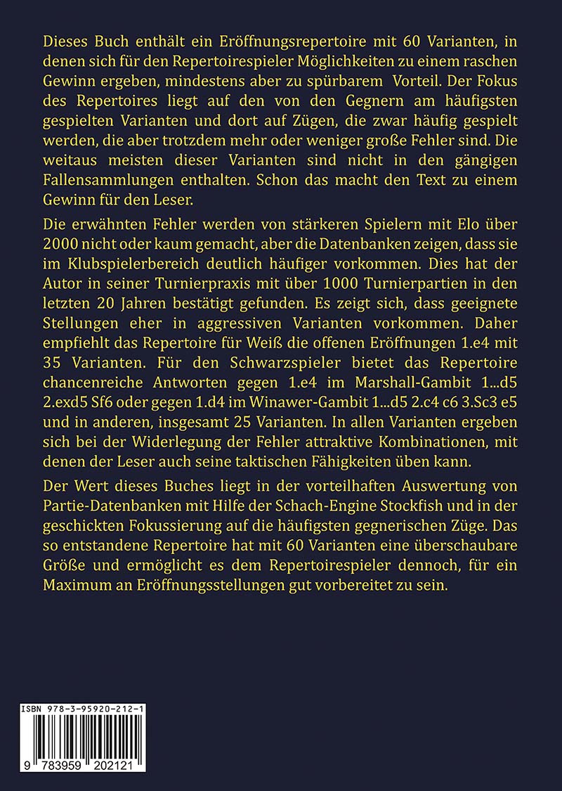 Dieses Buch enthält ein Eröffnungsrepertoire mit 60 Varianten, in denen sich für den Repertoirespieler Möglichkeiten zu einem raschen Gewinn ergeben, mindestens aber zu spürbarem Vorteil. Der Fokus des Repertoires liegt auf den von den Gegnern am häufigsten gespielten Varianten und dort auf Zügen, die zwar häufig gespielt werden, die aber trotzdem mehr oder weniger große Fehler sind. Die weitaus meisten dieser Varianten sind nicht in den gängigen Fallensammlungen enthalten. Schon das macht den Text zu einem Gewinn für den Leser.